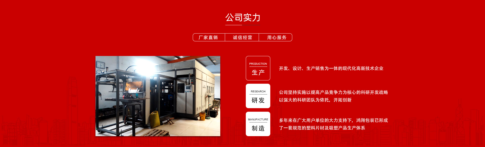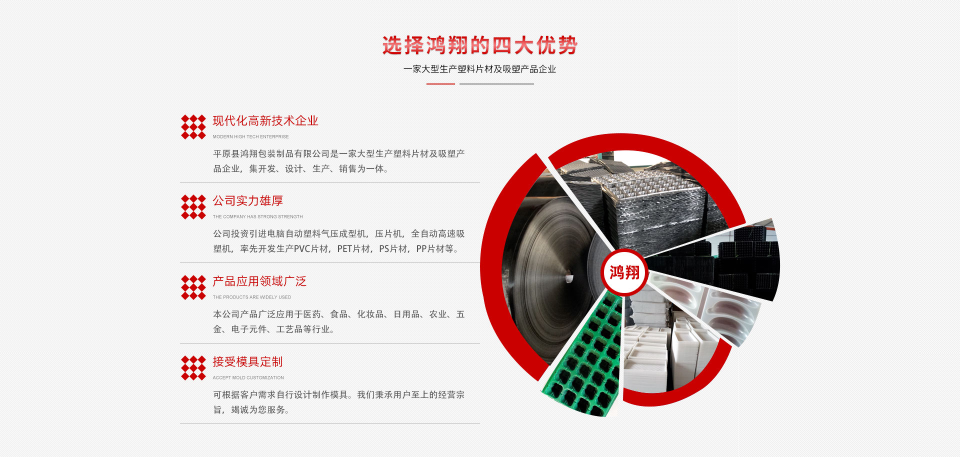 平原縣鴻翔包裝制品有限公司是一家大型生產(chǎn)塑料片材及吸塑產(chǎn)品企業(yè),本公司投資引進電腦自動塑料氣壓成型機,壓片機,全自動高速吸塑機,率先開發(fā)生產(chǎn)PVC片材,PET片材,PS片材,PP片材等,鴻翔是國內(nèi)先進的生產(chǎn)廠家之一。本公司產(chǎn)品廣泛應用于醫(yī)藥、食品、化妝品、日用品、農(nóng)業(yè)、五金、電子元件、工藝品等行業(yè),也可根據(jù)客戶需求自行設計制作模具。本公司技術(shù)力量雄厚,生產(chǎn)設備工藝先進。我們秉承用戶至上的經(jīng)營宗旨,竭誠為您服務。